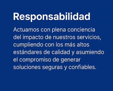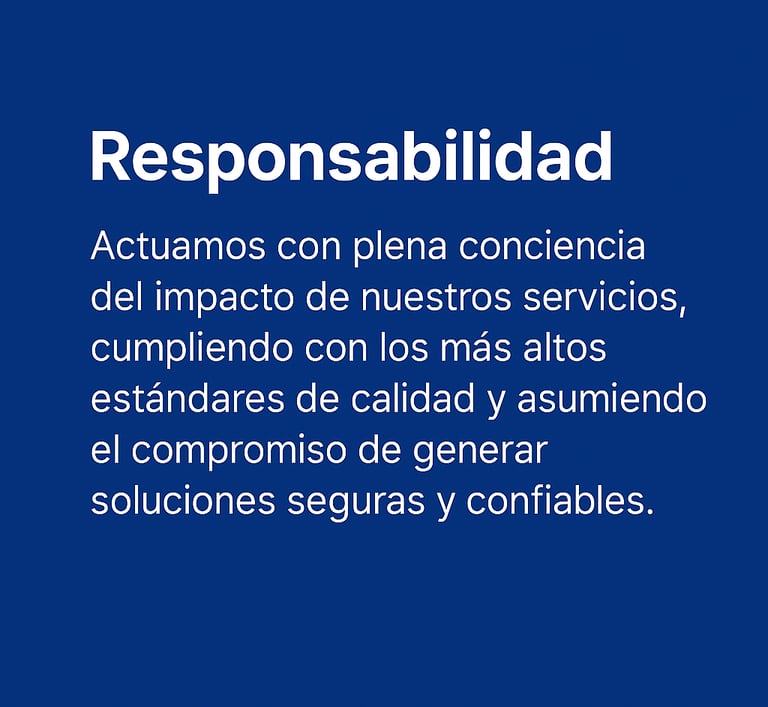 Actuamos con integridad, transparencia y respeto, guiando nuestras decisiones bajo principios éticos que fortalecen nuestra credibilidad y reputación.
